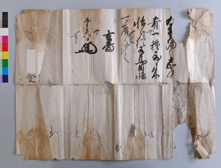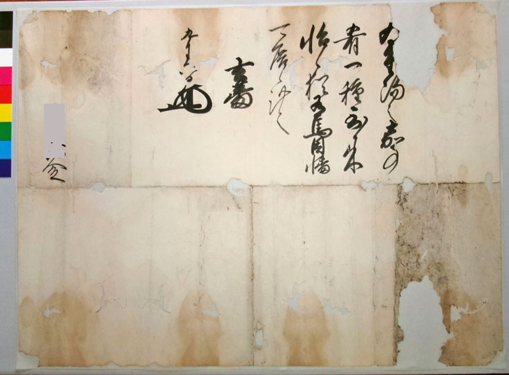 【古文書の状態】 奉書紙という分厚い和紙に書かれています。損傷がかなりあり、保存展示が困難なレベルです。
