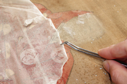和紙や絹で損傷の穴を埋める作業です。